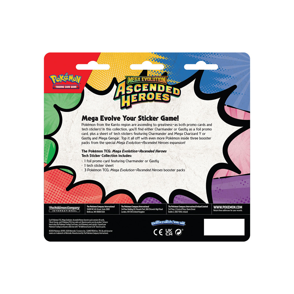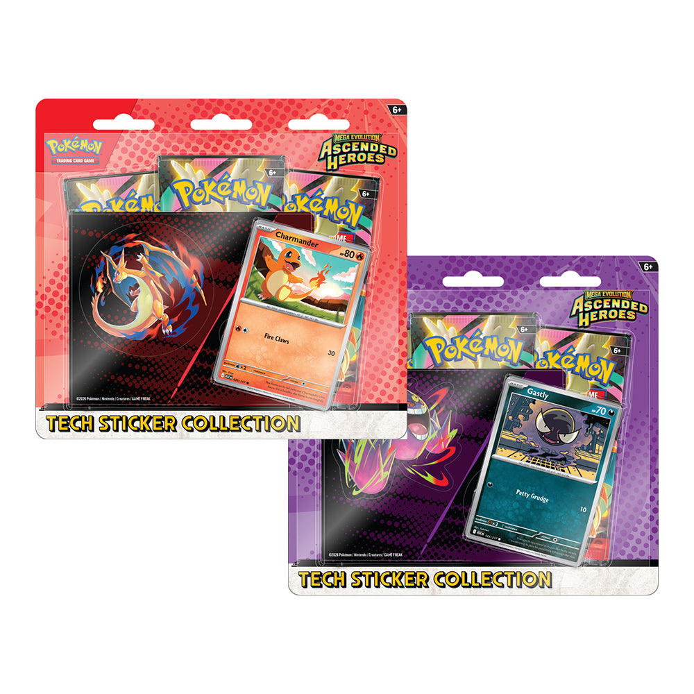 Pokémoni iz regije Kanto se vzpenjajo med legende – tako kot promo karte kot tudi v obliki tech nalepk! V tej kolekciji boste našli bodisi Charmandra ali Gastlyja kot folijsko promo karto ter list tech nalepk s Charmandrom in Mega Charizardom Y ali Gastlyjem in Mega Gengarjem. Vse skupaj dopolnjujejo še trije booster paketi iz posebne razširitve Mega Evolution — Ascended Heroes.