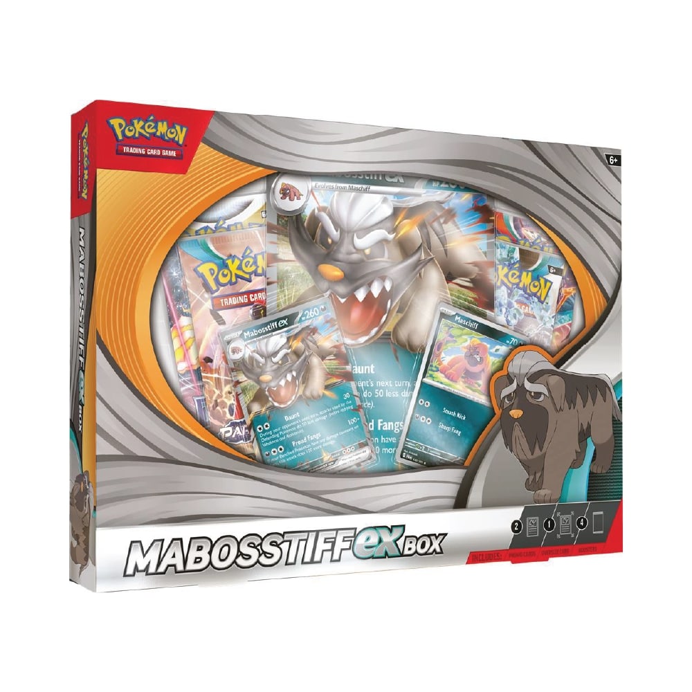 Speel als een baas met Mabosstiff ex! Mabosstiff is normaal gesproken zachtaardig, maar kan intimiderend zijn wanneer hij zijn tanden laat zien terwijl hij zijn bondgenoten beschermt. Hier vind je Mabosstiff ex als een foil promokaart in zowel de speelbare als de grote versie, samen met de Rascal Pokémon Mashiff - die voor het eerst als foilkaart verschijnt. Er is ook een Pokémon TCG Live-codekaart beschikbaar, met exemplaren van Mashiff en Mabosstiff ex om online te spelen.